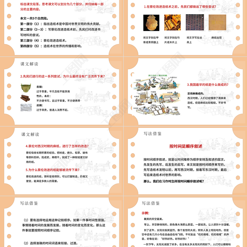 寫法借鑒按時間是順序敘述 按時間順序敘述,就是以時間推移為順序安排及敘述的層次,先發(fā)生的先寫,后發(fā)生的后寫。本文就是按時間順序來寫的,先寫造紙術發(fā)明以前,再寫西漢時期,接著寫東漢時期,最后寫后來造紙術對世界的影響。 那么,我們在習作時怎樣按時間順序敘述呢?