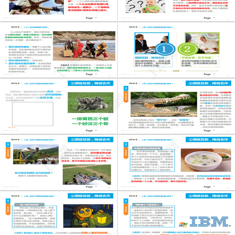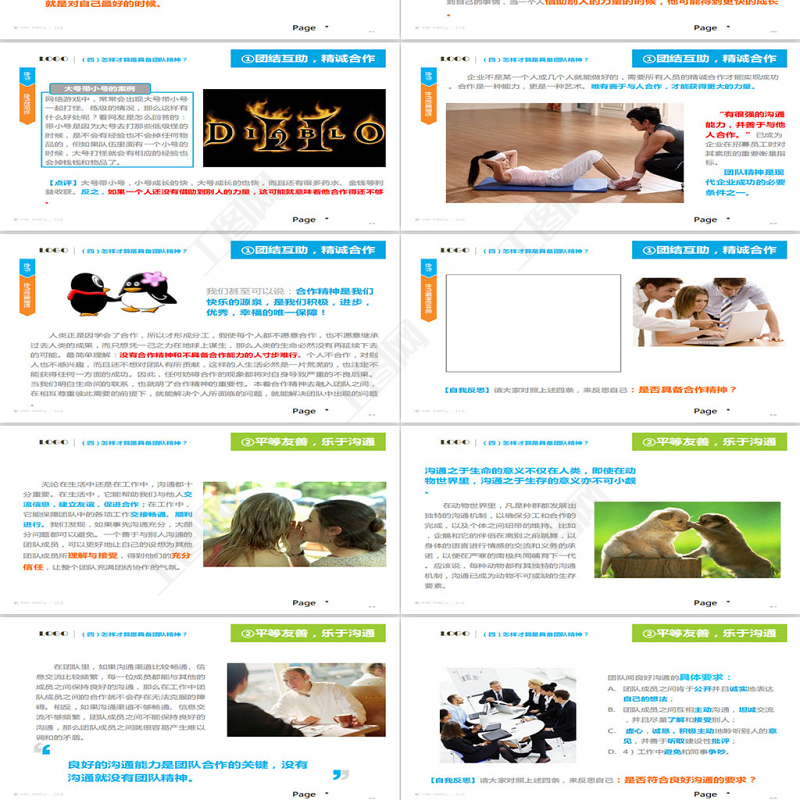 22? *** ***Co., Ltd. Page *LOGO(四)怎樣才算是具備團隊精神?①團結互助,精誠合作 人類正是因學會了合作,所以才形成分工,假使每個人都不愿意合作,也不愿意繼承過去人類的成果,而只想憑一己之力在地球上謀生,那么人類的生命必然沒有再延續(xù)下去的可能。最簡單理解:沒有合作精神和不具備合作能力的人寸步難行。個人不合作,對別人也不感興趣,而且還不想對團隊有所貢獻,這樣的人生活必然是一片荒蕪的,也注定不能獲得任何一方面的成功。因此,任何妨礙合作的現(xiàn)象都將對自身導致嚴重的不良后果。當我們明白生命間的聯(lián)系,也就明了合作精神的重要性。本著合作精神去融入團隊之間,在相互尊重彼此需要的前提下,就能解決個人所面臨的問題,就能解決團隊中出現(xiàn)的問題。 我們甚至可以說:合作精神是我們快樂的源泉,是我們積極,進步,優(yōu)秀,幸福的唯一保障!
