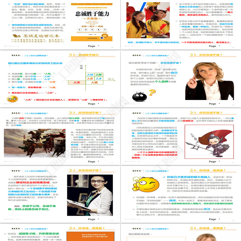 51? *** ***Co., Ltd. Page *LOGO(三)怎樣做到忠誠?忠誠不同于一味的阿諛奉承,不用嘴巴說出來的,它不僅要經(jīng)受考驗,而且還表現(xiàn)在你的行動和行為上。當然,忠誠勝于能力,并不是對能力的否定。一個只有忠誠而無能力的人,是無用之人。忠誠,是要用業(yè)績來證明的,而不是口頭上的效忠。比如一個天天跪在你面前表示忠誠于你,卻不肯為你做一點事,你稀罕這種“忠誠”嗎?你愿意因為他“忠誠”而把他養(yǎng)起來嗎?