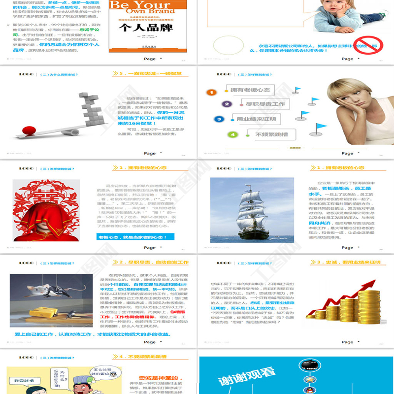 50? *** ***Co., Ltd. Page *LOGO(三)怎樣做到忠誠? 在競爭的時代,謀求個人利益、自我實現(xiàn)是天經(jīng)地義的。但是,遺憾的是很多人沒有意識到個性解放、自我實現(xiàn)與忠誠和敬業(yè)并不對立,它們是相輔相成、缺一不可的。許多年輕人以玩世不恭的姿態(tài)對待工作,他們頻繁跳槽,覺得自己工作是在出賣勞動力;他們蔑視敬業(yè)精神,嘲諷忠誠,將其視為老板盤剝、愚弄下屬的手段。他們認為自己之所以工作,不過是迫于生計的需要。而實際上,你糟蹋工作,工作也就會糟蹋你。理論上說,工作只是一種契約,倘若只將工作看成付出勞動獲得報酬,那么人與工具無異。 愛上自己的工作,認真對待工作,才能獲取比物質大的多的收益。