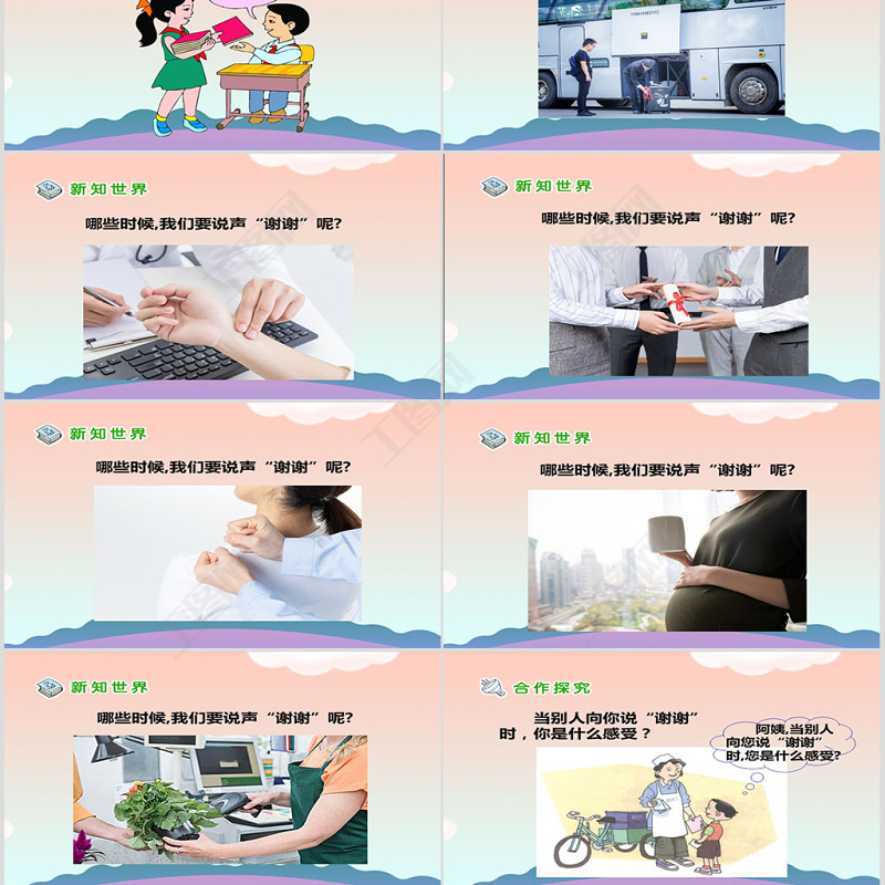<p>人教新課標三年級品德與社會下冊第四單元說聲“謝謝”</p><br><p></p><br><p>哪些時候,我們要說聲“謝謝”呢?</p><br><p>哪些時候,我們要說聲“謝謝”呢?</p><br><p>哪些時候,我們要說聲“謝謝”呢?</p><br><p>哪些時候,我們要說聲“謝謝”呢?</p><br><p>哪些時候,我們要說聲“謝謝”呢?</p><br><p>哪些時候,我們要說聲“謝謝”呢?</p><br><p> 當別人向你說“謝謝”時,你是什么感受?</p><br><p> 當你為別人做了事情,別人沒有說“謝謝”時,你是什么感受?</p><br><p>尊敬別人僅僅是說聲“謝謝”嗎? 大家可以通過各種方式搜集信息,看看誰最有禮貌! </p><br><p>請給這個故事一個合適的結尾!</p><br><p>版權聲明感謝您下載辦圖網平臺上提供的PPT作品,為了您和辦圖網以及原創(chuàng)作者的利益,請勿復制、傳播、銷售,否則將承擔法律責任!辦圖網將對作品進行維權,按照傳播下載次數進行十倍的索取賠償!1.在辦圖網出售的PPT模板是免版稅類(RF:Royalty-Free)正版受《中國人民共和國著作法》和《世界版權公約》的保護,作品的所有權、版權和著作權歸辦圖網所有,您下載的是PPT模板素材的使用權。2.不得將辦圖網的PPT模板、PPT素材,本身用于再出售,或者出租、出借、轉讓、分銷、發(fā)布或者作為禮物供他人使用,不得轉授權、出賣、轉讓本協(xié)議或者本協(xié)議中的權利。更多精品PPT模板:www.888ppt.com</p><br><p>人教新課標三年級品德與社會下冊第四單元說聲“謝謝”</p><br>
