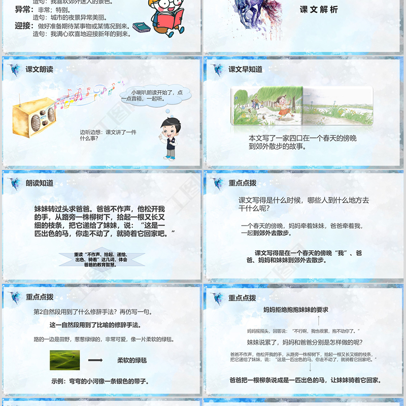 本文寫了一家四口在一個春天的傍晚到郊外散步的故事。課文早知道
