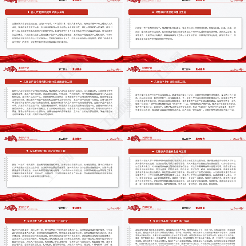 第二部分 重點任務深入抓黨建促鄉(xiāng)村振興,充分發(fā)揮農(nóng)村基層黨組織領導作用和黨員先鋒模范作用。大力開展鄉(xiāng)村振興主題培訓。選優(yōu)配強鄉(xiāng)鎮(zhèn)領導班子特別是黨政正職。充實加強鄉(xiāng)鎮(zhèn)工作力量。持續(xù)優(yōu)化村“兩委”班子特別是帶頭人隊伍,推動在全面推進鄉(xiāng)村振興中干事創(chuàng)業(yè)。派強用好駐村第一書記和工作隊,健全常態(tài)化駐村工作機制,做到脫貧村、易地扶貧搬遷安置村(社區(qū))、鄉(xiāng)村振興任務重的村、黨組織軟弱渙散村全覆蓋,推動各級黨組織通過駐村工作有計劃地培養(yǎng)鍛煉干部。加大在青年農(nóng)民特別是致富能手、農(nóng)村外出務工經(jīng)商人員中發(fā)展黨員力度。強化縣級黨委統(tǒng)籌和鄉(xiāng)鎮(zhèn)、村黨組織引領,推動發(fā)展壯大村級集體經(jīng)濟。常態(tài)化整頓軟弱渙散村黨組織。完善黨組織領導的鄉(xiāng)村治理體系,推行網(wǎng)格化管理和服務,做到精準化、精細化,推動建設充滿活力、和諧有序的善治鄉(xiāng)村。推進更高水平的平安法治鄉(xiāng)村建設,依法嚴厲打擊農(nóng)村黃賭毒、侵害農(nóng)村婦女兒童人身權利等各種違法犯罪行為,切實維護農(nóng)村社會平安穩(wěn)定。