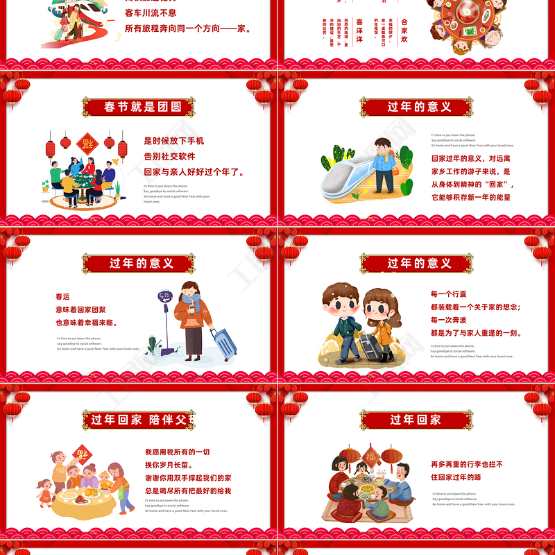 闔家團(tuán)圓,共享天倫 過(guò)年了, 有錢(qián)沒(méi)錢(qián),回家過(guò)年 一家人團(tuán)團(tuán)圓圓過(guò)大年!t's time to put down the phone. Say goodbye to social software Go home and have a good New Year with your loved ones.過(guò)年回家