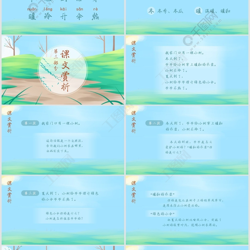 課文賞析我家門(mén)口有一棵小樹(shù)。 冬天到了, 爺爺給小樹(shù)穿上暖和的衣裳。 小樹(shù)不冷了。 夏天到了, 小樹(shù)給爺爺撐開(kāi)綠色的小傘。 爺爺不熱了。