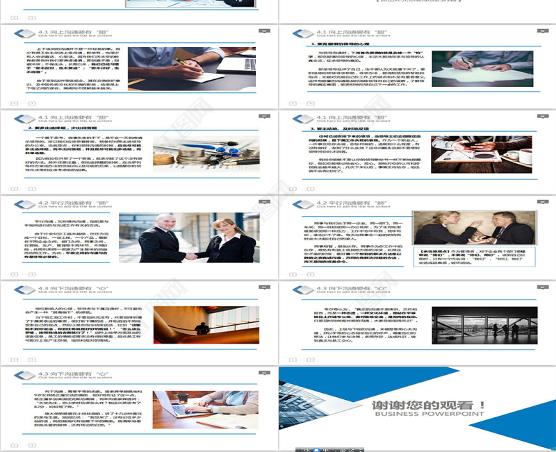 59Click here to add the title text content4.1 向上溝通要有“膽” 3. 要主動(dòng)地、及時(shí)地反饋任何已經(jīng)安排下來的事項(xiàng),當(dāng)領(lǐng)導(dǎo)主動(dòng)去提醒或追問的時(shí)候,是下屬工作失敗的表現(xiàn)。作為一個(gè)職業(yè)人,一件事交給你去做,你如何做的,進(jìn)展到什么程度,有沒有做好,收到了什么實(shí)效?這些問題永遠(yuǎn)都不要等到領(lǐng)導(dǎo)問你時(shí)才回答。假如你能夠不要讓你的領(lǐng)導(dǎo)象秘書一樣不斷地提醒你,假如你能夠讓他省心、放心。那他對(duì)你的認(rèn)可和授權(quán)就會(huì)越來越大,幾次下來以后,事情交待給你,他也就不會(huì)再過問了。