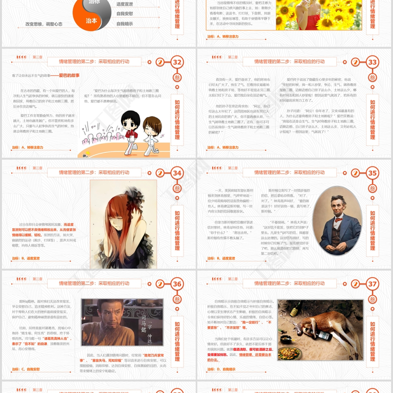 情緒管理的第二步:采取相應(yīng)的行動(dòng)2【總結(jié)】改變心情是治標(biāo),調(diào)整心態(tài)才是治本,治標(biāo)和治本要同時(shí)進(jìn)行,但要提醒自己:只有采用治本的方法才能將情緒問題根本解決,只要我們的觀念、我們的心態(tài)一改變,我們的情緒自然也就會(huì)相應(yīng)改變。我們不能決定生命的長度,但我們可以擴(kuò)展它的寬度;我們不能改變天生的容貌,但我們可以時(shí)時(shí)展現(xiàn)笑容;我們不能企望控制他人,但我們可以好好掌握自己;我們不能全然預(yù)知明天,但我們可以充分利用今天;我們不能要求事事順利,但我們可以做到事事盡心。