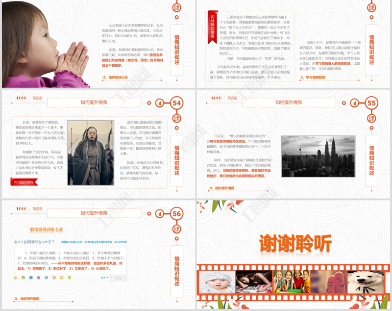 如何提升情商41、把看不順的人看順;2、把看不起的人看起;3、把不想做的事做好;4、把想不通的事想通;5、把快罵出的話收回;6、把咽不下氣的咽下;7、把想放縱的心收住;——你不需每時(shí)每刻這樣做,但這樣多做幾回,你就會(huì):1)情商高了;2)職位升了;3)工資漲了;4)心情爽了。職場情商訓(xùn)練七法