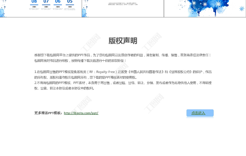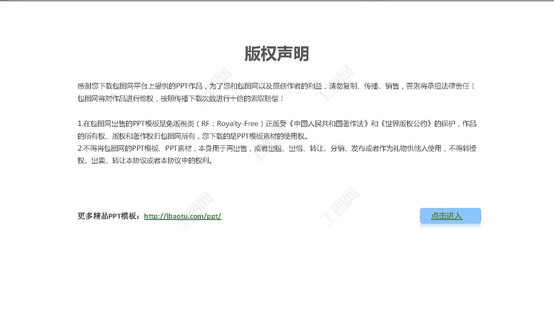 版權(quán)聲明感謝您下載辦圖網(wǎng)平臺上提供的PPT作品,為了您和辦圖網(wǎng)以及原創(chuàng)作者的利益,請勿復制、傳播、銷售,否則將承擔法律責任!辦圖網(wǎng)將對作品進行維權(quán),按照傳播下載次數(shù)進行十倍的索取賠償!1.在辦圖網(wǎng)出售的PPT模板是免版稅類(RF:Royalty-Free)正版受《中國人民共和國著作法》和《世界版權(quán)公約》的保護,作品的所有權(quán)、版權(quán)和著作權(quán)歸辦圖網(wǎng)所有,您下載的是PPT模板素材的使用權(quán)。2.不得將辦圖網(wǎng)的PPT模板、PPT素材,本身用于再出售,或者出租、出借、轉(zhuǎn)讓、分銷、發(fā)布或者作為禮物供他人使用,不得轉(zhuǎn)授權(quán)、出賣、轉(zhuǎn)讓本協(xié)議或者本協(xié)議中的權(quán)利。更多精品PPT模板: ://888ppt.com/ppt/