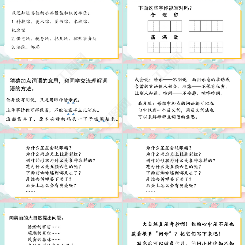 浩瀚的宇宙…… 璀璨的星空…… 茂密的森林…… 各種各樣的鳥兒和昆蟲…… 奇形怪狀的植物…… ……向美麗的大自然提出問(wèn)題。