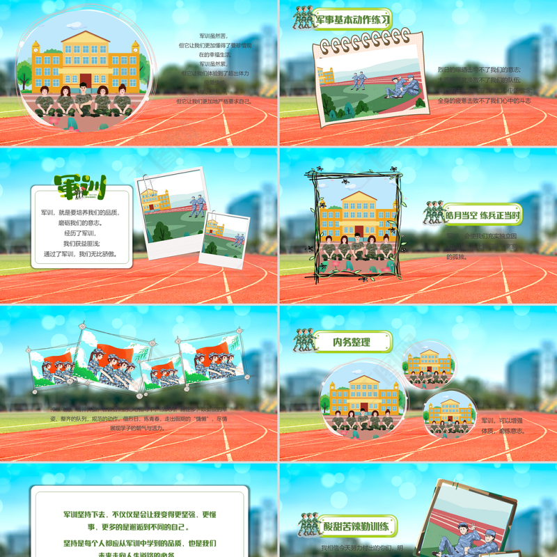 2021開學軍訓學生風采PPT卡通風格開學季專題課件模板下載