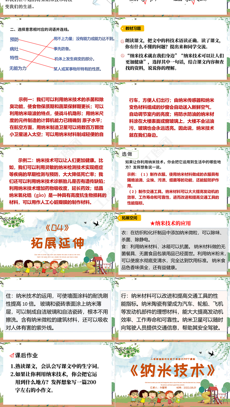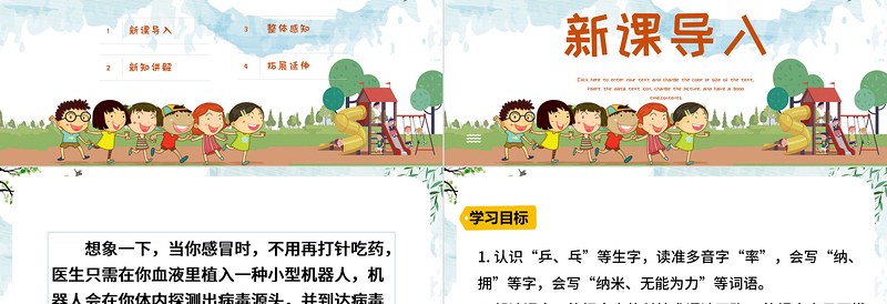 Click here to enter your text and change the color or size of the text. Insert the data text icon, change the picture, and have a good time.contents人教部編版四年級下冊語文PPT模板《納米技術》匯報人:辦圖網(wǎng) 時間:2022.08.01