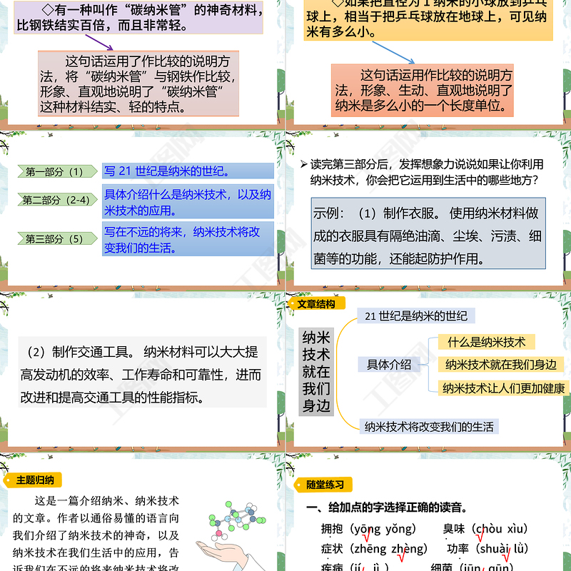朗讀課文,把文中的科技術語讀正確。讀了課文,你有什么不懂的問題?提出來和同學交流。教材習題“納米技術就在我們身邊”“納米技術可以讓人們更加健康”,選擇其中一句話,結合課文內容和查找的資料,說說你的理解。
