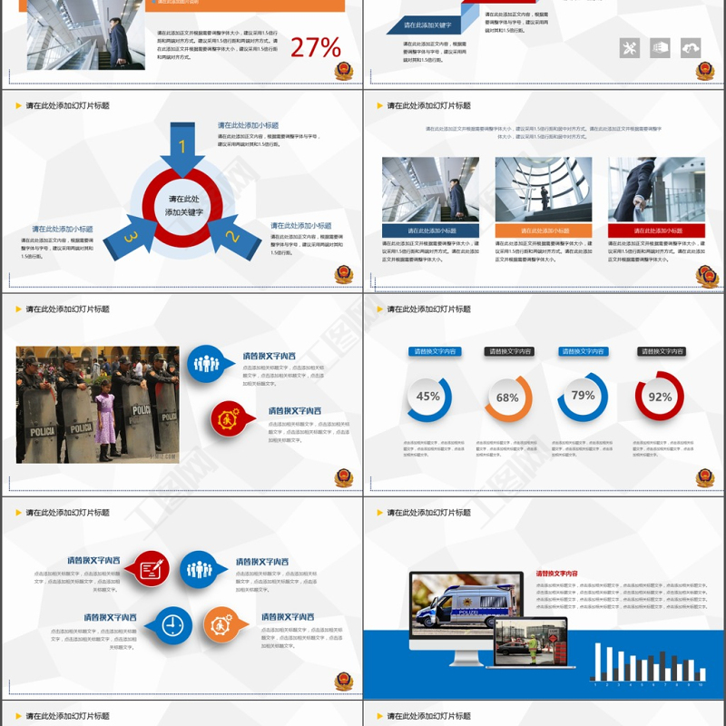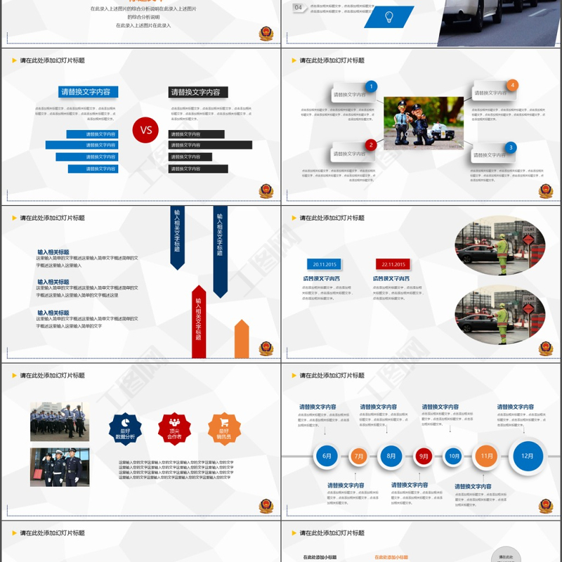 簡(jiǎn)潔藍(lán)紅色公安警察工作總結(jié)匯報(bào)PPT模板 Array