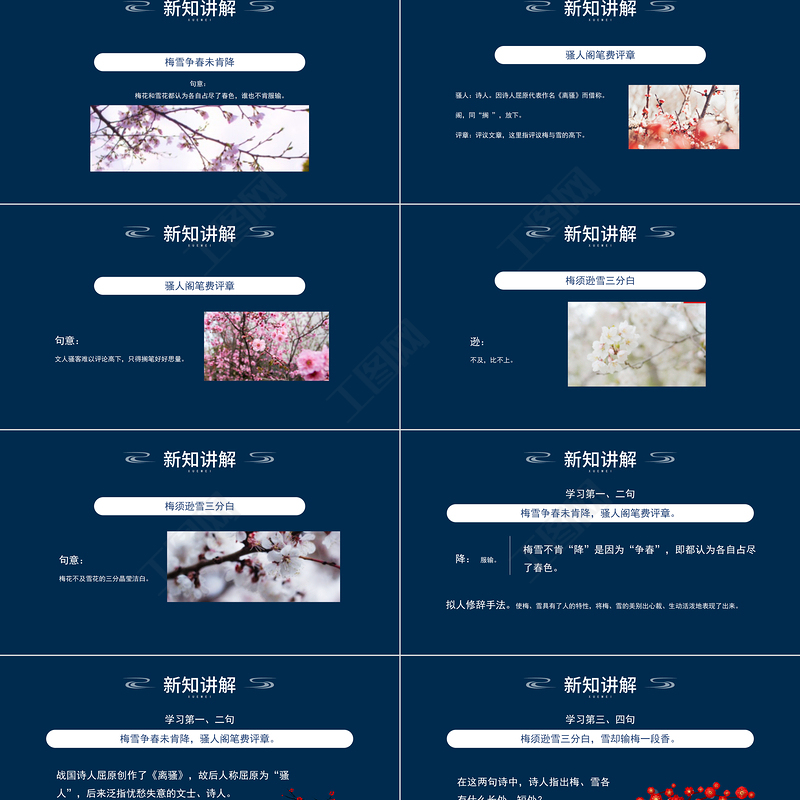 新知講解XUEMEI梅雪爭(zhēng)春未肯降,騷人閣筆費(fèi)評(píng)章。學(xué)習(xí)第一、二句戰(zhàn)國(guó)詩(shī)人屈原創(chuàng)作了《離騷》,故后人稱屈原為“騷人”,后來泛指憂愁失意的文士、詩(shī)人。想象:你認(rèn)為“騷人”應(yīng)如何評(píng)議梅、雪?