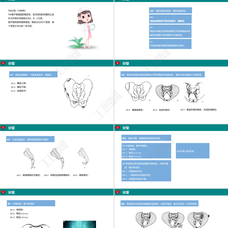 A型:穩(wěn)定骨盆環(huán)損傷,骨折輕度移位。A1:骨盆邊緣骨折不累及骨盆環(huán),撕脫傷;A2:骨盆環(huán)有骨折或有輕度移位不影響骨盆環(huán)的穩(wěn)定性通常只有掃描技術才能發(fā)現(xiàn)。A3:不波及骨盆環(huán)骶骨或尾骨骨折無移位;分型