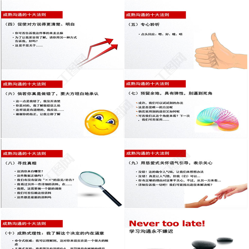 命令式權(quán)威:我可以理解到,這對(duì)你來(lái)說(shuō)實(shí)在是一個(gè)很大的顧慮兒童式直接:我希望沒(méi)有說(shuō)錯(cuò)什么,而導(dǎo)致你有被騙的感覺(jué)成熟式理性:我們已詳細(xì)討論過(guò)所有的方法,始終覺(jué)得這是最好的或許我們不必急躁地立即作決定,大家分頭思考一下,改天再議可能對(duì)我們更有利成熟溝通的十大法則(十)成熟式理性:我了解這個(gè)決定的內(nèi)在涵意