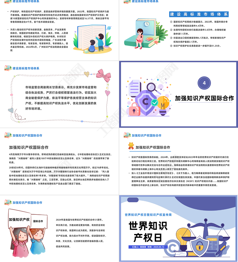 工圖網(wǎng)提供世界知識(shí)產(chǎn)權(quán)日PPT卡通風(fēng)世界知識(shí)產(chǎn)權(quán)日暨知識(shí)產(chǎn)權(quán)宣傳周課件模板供會(huì)員免費(fèi)下載。更多精彩黨課PPT素材,盡在工圖網(wǎng)。