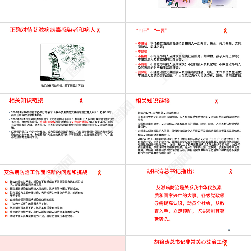 相關(guān)知識鏈接 ? 2003年2月20日教育部辦公廳印發(fā)了《中小學(xué)生預(yù)防艾滋病專題教育大綱》:初中6課時(shí),高中及中等職業(yè)學(xué)校4課時(shí)。2006年3月1日國務(wù)院頒布實(shí)施了《艾滋病防治條例》:縣級以上人民政府教育主管部門應(yīng)當(dāng)指導(dǎo)、督促高等院校、中等職業(yè)學(xué)校和普通中學(xué)將艾滋病防治知識納入有關(guān)課程,開展有關(guān)課外教育活動(dòng)。高等院校、中等職業(yè)學(xué)校和普通中學(xué)應(yīng)當(dāng)組織學(xué)生學(xué)習(xí)艾滋病防治知識。紅絲帶的意義:作為一種標(biāo)志,成為艾滋病防治的象征。它象征著我們對艾滋病患者和感染者的關(guān)心與支持,象征著我們對生命的熱愛和對平等的渴望,象征著我們要用“心”來參與預(yù)防艾滋病的工作。
