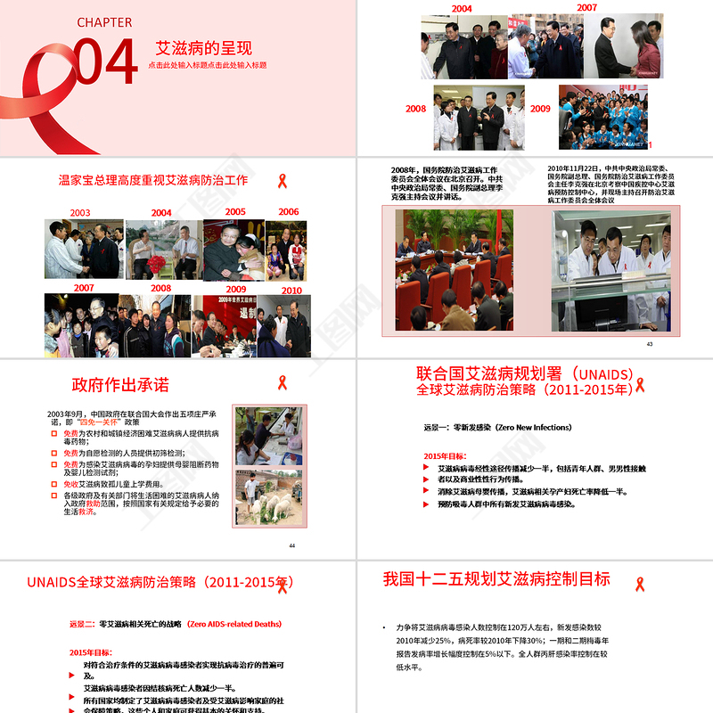 44政府作出承諾 2003年9月,中國政府在聯(lián)合國大會(huì)作出五項(xiàng)莊嚴(yán)承諾,即“四免一關(guān)懷”政策免費(fèi)為農(nóng)村和城鎮(zhèn)經(jīng)濟(jì)困難艾滋病病人提供抗病毒藥物;免費(fèi)為自愿檢測的人員提供初篩檢測;免費(fèi)為感染艾滋病病毒的孕婦提供母嬰阻斷藥物及嬰兒檢測試劑;免收艾滋病致孤兒童上學(xué)費(fèi)用。各級政府及有關(guān)部門將生活困難的艾滋病病人納入政府救助范圍,按照國家有關(guān)規(guī)定給予必要的生活救濟(jì)。 ?