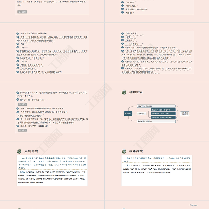 結(jié)構(gòu)圖示母愛(ài)偉大 深受母親慈母情深要錢(qián)買(mǎi)書(shū)看見(jiàn)母親:疲弱、脊背彎曲掙錢(qián)的艱辛:貧苦、辛苦給錢(qián)買(mǎi)書(shū)毫不猶豫:通情達(dá)理如愿以?xún)敚焊屑つ赣H渴望買(mǎi)書(shū):失魂落魄