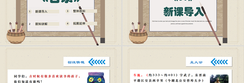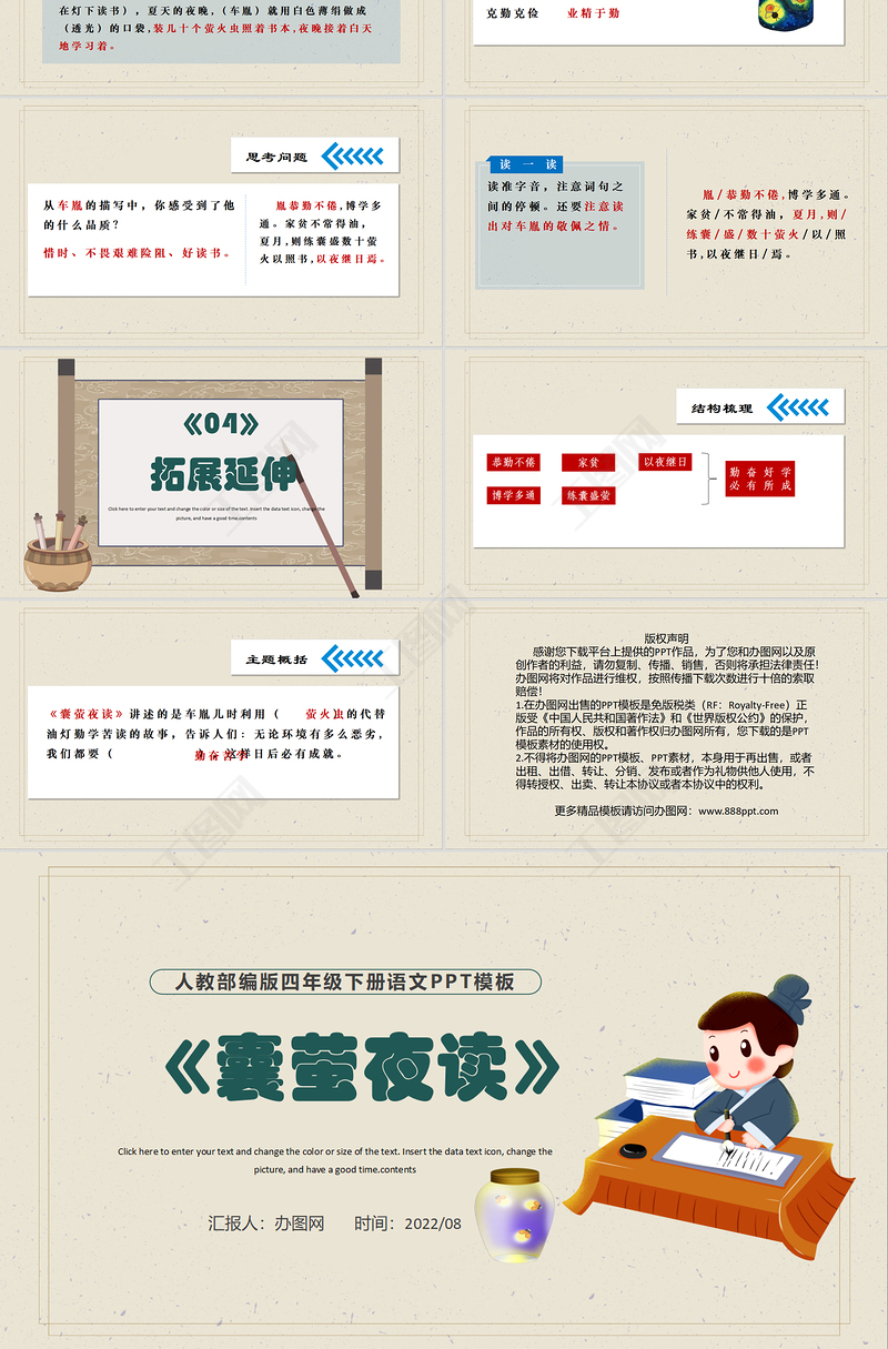 Click here to enter your text and change the color or size of the text. Insert the data text icon, change the picture, and have a good time.contents人教部編版四年級下冊語文PPT模板《囊螢夜讀》匯報人:辦圖網(wǎng) 時間:2022/08