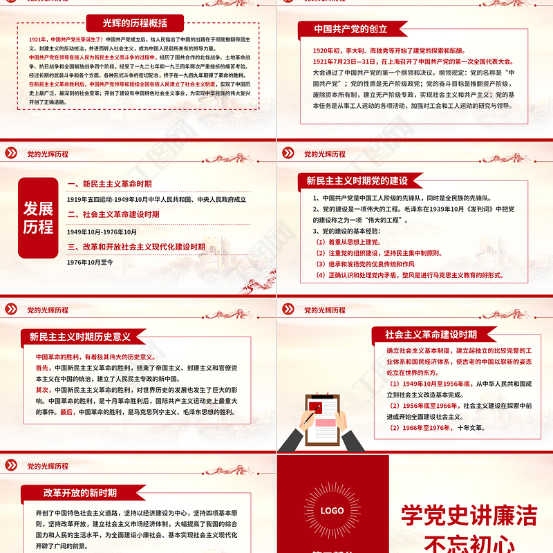 中國(guó)共產(chǎn)黨歷史是中國(guó)共產(chǎn)黨從1921年7月1日成立以來(lái)整個(gè)發(fā)展過(guò)程的全部歷史。主要包括中國(guó)共產(chǎn)黨歷次代表大會(huì)的情況、黨章的不斷完善過(guò)程、黨在各個(gè)不同時(shí)期的組織建設(shè)和發(fā)展?fàn)顩r、黨領(lǐng)導(dǎo)全國(guó)各族人民進(jìn)行革命和建設(shè)的發(fā)展歷程和全部史實(shí)的記載。前 言LOGO