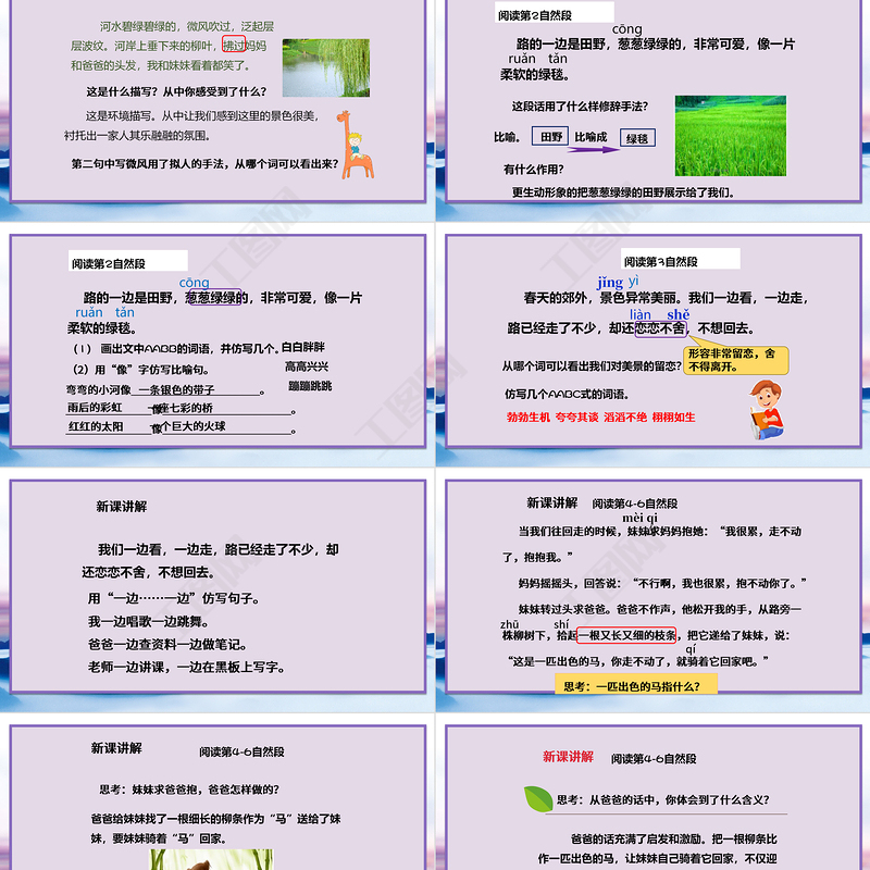 新課講解閱讀第4-6自然段思考:從爸爸的話中,你體會到了什么含義? 爸爸的話充滿了啟發(fā)和激勵。把一根柳條比作一匹出色的馬,讓妹妹自己騎著它回家,不僅迎合了小孩子好奇的心理,同時也暗示妹妹要學會自己克服困難。這句話包含了父親的教育智慧。