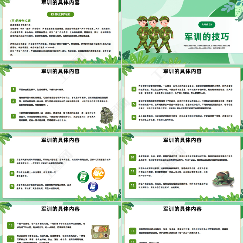 > 匯報(bào)|報(bào)告PPT > 2023迷彩軍訓(xùn)青春無悔PPT卡通風(fēng)秋季開學(xué)新生軍訓(xùn)課件模板下載.PPTX 【圖片、文字、動(dòng)畫均可編輯】