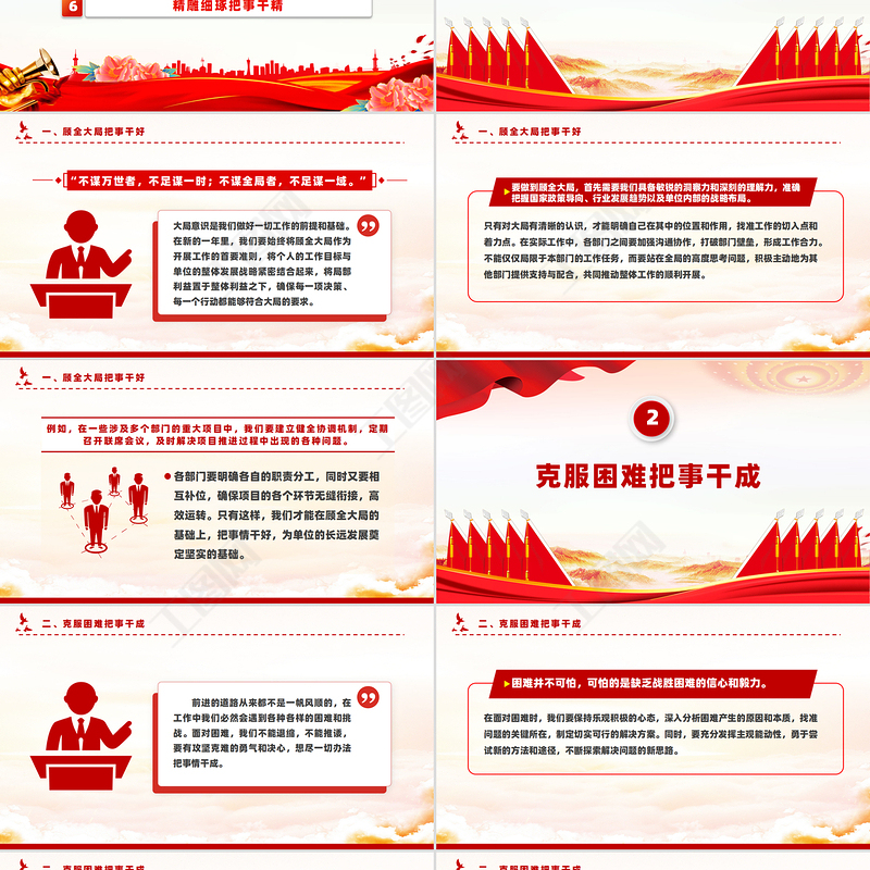 二、克服困難把事干成? 前進的道路從來都不是一帆風(fēng)順的,在工作中我們必然會遇到各種各樣的困難和挑戰(zhàn)。面對困難,我們不能退縮,不能推諉,要有攻堅克難的勇氣和決心,想盡一切辦法把事情干成。