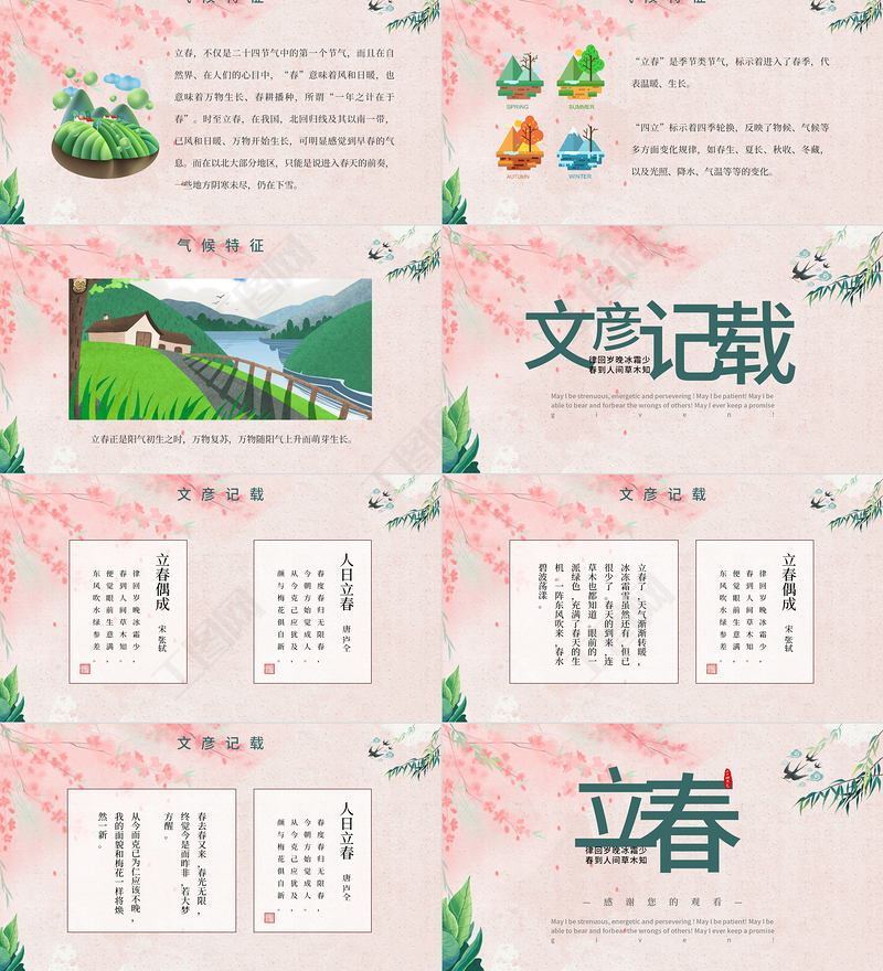 <p>立春律回歲晚冰霜少春到人間草木知—春風(fēng)和氣,草長鶯飛—May I be strenuous, energetic and persevering ! May I be patient! May I be able to bear and forbear the wrongs of others! May I ever keep a promise given!</p><br><p>目錄—CONTENTS—立春的介紹The origin of Big Chill壹傳統(tǒng)的美食The etymology of Big Chill貳氣候的特征The custom of Big Chill叁文彥的記載The poetry of Big Chill肆</p><br><p>節(jié)氣介紹律回歲晚冰霜少春到人間草木知</p><br><p>節(jié)氣介紹立春,是二十四節(jié)氣之一,又名歲節(jié)、正月節(jié)、立春節(jié)、歲旦等。立,是“開始”之意;春,代表著溫暖、生長。上古“斗柄指向”法,以北斗星斗柄指向寅位時為立春?,F(xiàn)行的“定氣法”劃分節(jié)氣,以太陽到達(dá)黃經(jīng)315°時為立春。</p><br><p>節(jié)氣介紹干支紀(jì)元,以立春為歲首,立春意味著新的一個輪回已開啟,乃萬物起始、一切更生之義也。秦漢以前,禮俗所重的不是陰歷一月(正月)初,而是立春日。重大的拜神祭祖、納福祈年、驅(qū)邪攘災(zāi)、除舊布新、迎春和農(nóng)耕慶典等均安排在立春日及其前后幾天舉行,這一系列的節(jié)慶活動不僅構(gòu)成了后世歲首節(jié)慶的框架,而且它的民俗功能也一直遺存至今。</p><br><p>節(jié)氣介紹立春作為“二十四節(jié)氣”之一,與立夏、立秋、立冬一樣,反映著一年四季的更替。春,意味著風(fēng)和日暖、萬物生長。由于中國幅員遼闊,各地的氣候相差懸殊,“立”的具體氣候意義并不適用于全國各地,所對應(yīng)的地域只是位于北回歸線上的華南地區(qū),冬春分界線在廣西桂林到江西贛州一線。</p><br><p>傳統(tǒng)美食律回歲晚冰霜少春到人間草木知May I be strenuous, energetic and persevering ! May I be patient! May I be able to bear and forbear the wrongs of others! May I ever keep a promise given!</p><br><p>傳統(tǒng)美食春盤是立春飲食風(fēng)俗之一,主要是蔬菜取生菜瓜果餅糖放盤中為春盤(或拼成盤)饋送親友或自食取迎春之意。盤里主要有:果品、蔬菜、糖果、餅、餌五種。</p><br><p>傳統(tǒng)美食田艾籺是春季常見的時令食品。在開春時節(jié),萬物復(fù)蘇,草長鶯飛,正是春耕的田野上田艾生長的全盛時期,田艾約10厘米高,葉子是粉綠色的,花朵白中間綠,全身長滿絨毛。</p><br><p>傳統(tǒng)美食春餅春卷</p><br><p>氣候特征律回歲晚冰霜少春到人間草木知May I be strenuous, energetic and persevering ! May I be patient! May I be able to bear and forbear the wrongs of others! May I ever keep a promise given!</p><br><p>氣候特征立春,不僅是二十四節(jié)氣中的第一個節(jié)氣,而且在自然界、在人們的心目中,“春”意味著風(fēng)和日暖,也意味著萬物生長、春耕播種,所謂“一年之計在于春”。時至立春,在我國,北回歸線及其以南一帶,已風(fēng)和日暖、萬物開始生長,可明顯感覺到早春的氣息。而在以北大部分地區(qū),只能是說進(jìn)入春天的前奏,一些地方陰寒未盡,仍在下雪。</p><br><p>氣候特征“立春”是季節(jié)類節(jié)氣,標(biāo)示著進(jìn)入了春季,代表溫暖、生長。“四立”標(biāo)示著四季輪換,反映了物候、氣候等多方面變化規(guī)律,如春生、夏長、秋收、冬藏,以及光照、降水、氣溫等等的變化。</p><br><p>氣候特征立春正是陽氣初生之時,萬物復(fù)蘇,萬物隨陽氣上升而萌芽生長。</p><br><p>文彥記載律回歲晚冰霜少春到人間草木知May I be strenuous, energetic and persevering ! May I be patient! May I be able to bear and forbear the wrongs of others! May I ever keep a promise given!</p><br><p>文彥記載律回歲晚冰霜少,春到人間草木知。便覺眼前生意滿,東風(fēng)吹水綠參差。立春偶成宋·張軾春度春歸無限春,今朝方始覺成人。從今克己應(yīng)猶及,顏與梅花俱自新。人日立春唐·盧仝</p><br><p>文彥記載律回歲晚冰霜少,春到人間草木知。便覺眼前生意滿,東風(fēng)吹水綠參差。立春偶成宋·張軾立春了,天氣漸漸轉(zhuǎn)暖,冰凍霜雪雖然還有,但已很少了。春天的到來,連草木也都知道。眼前的一派綠色,充滿了春天的生機(jī)。一陣東風(fēng)吹來,春水碧波蕩漾。</p><br><p>文彥記載春度春歸無限春,今朝方始覺成人。從今克己應(yīng)猶及,顏與梅花俱自新。人日立春唐·盧仝春去春又來,春光無限,終覺今是而昨非,若大夢方醒。從今而克已為仁應(yīng)該不晚,我的面貌和梅花一樣將煥然一新。</p><br><p>立春律回歲晚冰霜少春到人間草木知—感謝您的觀看—May I be strenuous, energetic and persevering ! May I be patient! May I be able to bear and forbear the wrongs of others! May I ever keep a promise given!</p><br>