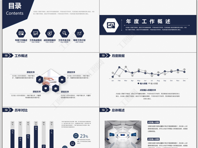 目錄 Contents年度工作概述(添加二級標題)工作完成情況(添加二級標題)成功項目展示(添加二級標題)工作不足之處(添加二級標題)明年工作計劃(添加二級標題)點擊輸入簡要文字解說,解說文字盡量概括精煉,不用多余的文字修飾,簡潔精準的 解說所提煉的核心概念。點擊輸入簡要文字解說,解說文字盡量概括精煉,不用多余的文字修飾,簡潔精準的 解說所提煉的核心概念。