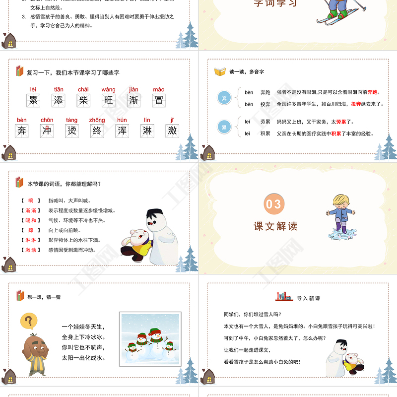 本節(jié)課會認識“累、添” 等15個新生字,會寫出8個生字,可以掌握本節(jié)課的多音字。 正確、流利、有感情地朗讀課文,注意讀準字音,讀通句子,給課文標上自然段。 感悟雪孩子的善良、勇敢、懂得當別人有困難時要勇于伸出援助之手,學習它舍己為人的精神。