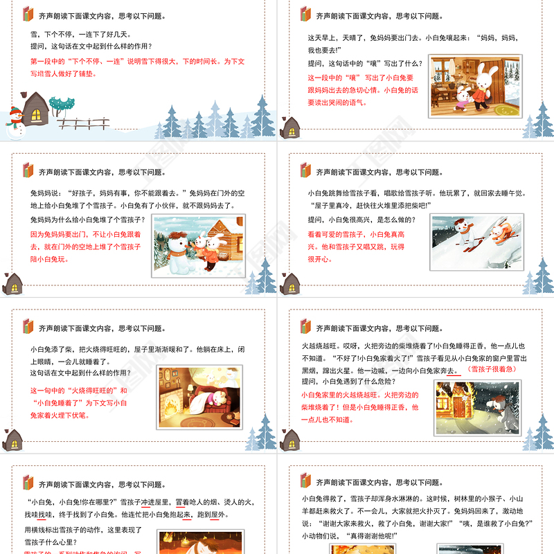 兔媽媽小白兔雪孩子堆雪人離開家得到雪人睡覺、著火(危險)(也要去)(玩累了)水(火)水蒸氣(曬)白云(飛向天空)勇敢 舍己為人
