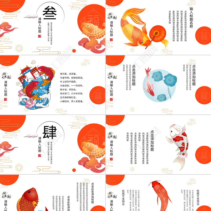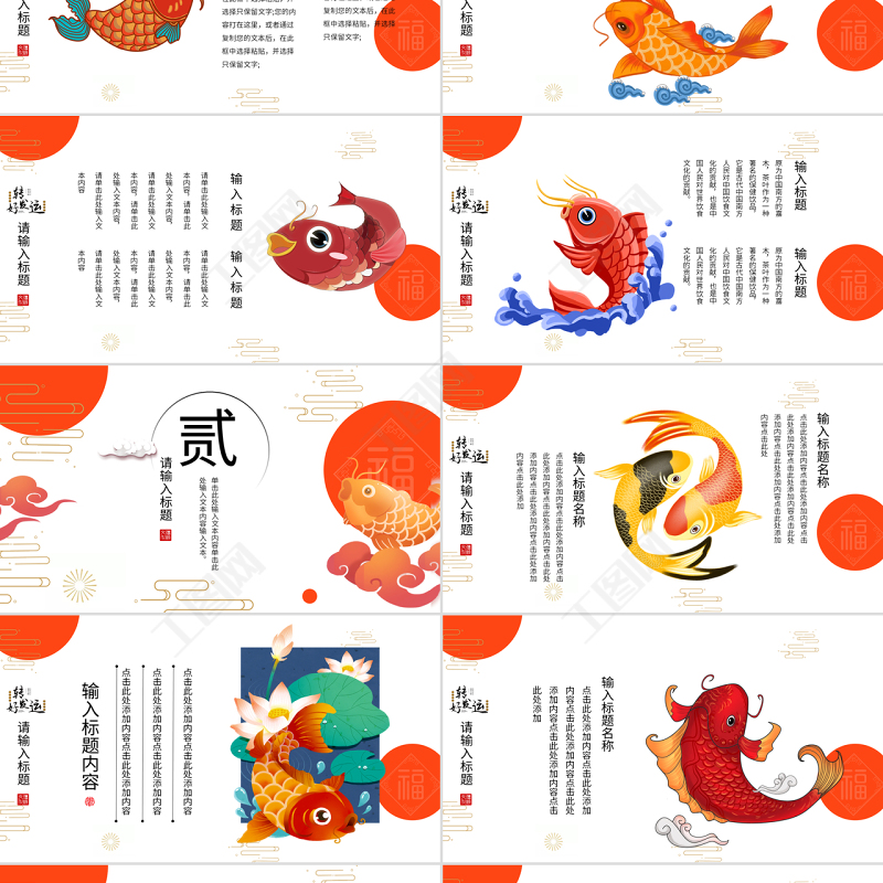 工圖網(wǎng)提供中國(guó)風(fēng)國(guó)潮轉(zhuǎn)發(fā)好運(yùn)鯉魚(yú)主題PPT模板供會(huì)員免費(fèi)下載。更多精彩黨課PPT素材,盡在工圖網(wǎng)。