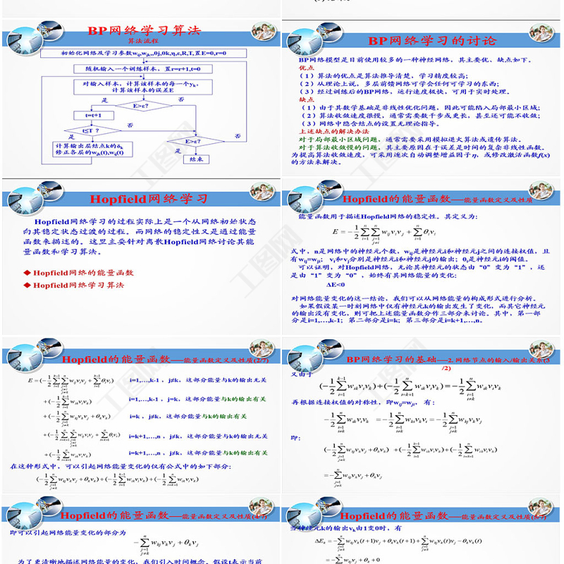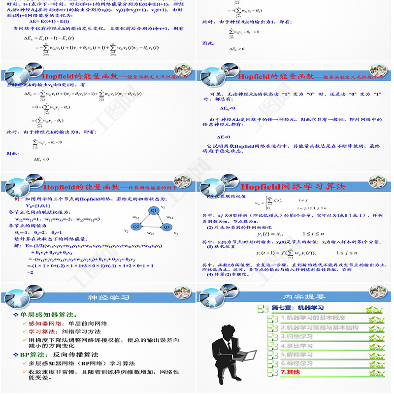 Hopfield網(wǎng)絡(luò)學(xué)習(xí) Hopfield網(wǎng)絡(luò)學(xué)習(xí)的過(guò)程實(shí)際上是一個(gè)從網(wǎng)絡(luò)初始狀態(tài)向其穩(wěn)定狀態(tài)過(guò)渡的過(guò)程。而網(wǎng)絡(luò)的穩(wěn)定性又是通過(guò)能量函數(shù)來(lái)描述的。這里主要針對(duì)離散Hopfield網(wǎng)絡(luò)討論其能量函數(shù)和學(xué)習(xí)算法。Hopfield網(wǎng)絡(luò)的能量函數(shù)Hopfield網(wǎng)絡(luò)學(xué)習(xí)算法