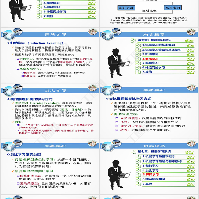歸納學(xué)習(xí)歸納學(xué)習(xí)(Induction Learning)歸納學(xué)習(xí)是目前研究得最多的學(xué)習(xí)方法,其學(xué)習(xí)目的是為了獲得新概念、構(gòu)造新規(guī)則或發(fā)現(xiàn)新理論。根據(jù)歸納學(xué)習(xí)有無(wú)教師指導(dǎo),可把它分為示例學(xué)習(xí):給學(xué)習(xí)者提供某一概念的一組正例和反例,學(xué)習(xí)者歸納出一個(gè)總的概念描述(規(guī)則),并使這個(gè)描述適合于所有的正例,排除所有的反例。觀察發(fā)現(xiàn)學(xué)習(xí):概念聚類:按照一定的方式和準(zhǔn)則分組,歸納概念機(jī)器發(fā)現(xiàn):從數(shù)據(jù)和事例中發(fā)現(xiàn)新知識(shí)