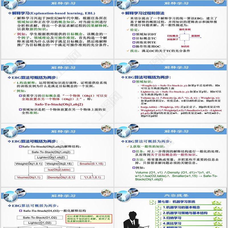 解釋學(xué)習(xí)EBG算法可概括為兩步:1.構(gòu)造解釋:運(yùn)用領(lǐng)域知識(shí)進(jìn)行演繹,證明提供給系統(tǒng)的訓(xùn)練實(shí)例為什么是滿足目標(biāo)概念的一個(gè)實(shí)例。例如:設(shè)要學(xué)習(xí)的目標(biāo)概念是 “一個(gè)物體(Obj1)可以安全地放置在另一個(gè)物體(Obj2)上”,即: Safe-To-Stack(Obj1,obj2)領(lǐng)域知識(shí)是把一個(gè)物體放置在另一個(gè)物體上面的安全性準(zhǔn)則: