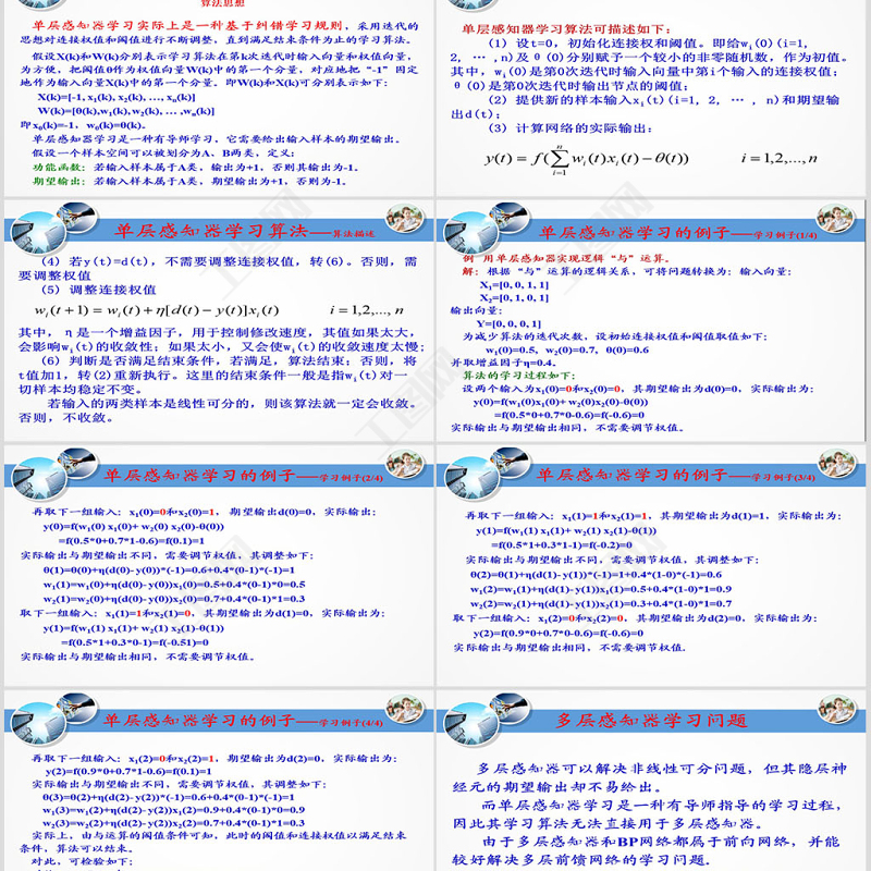 感知器學(xué)習(xí) 單層感知器學(xué)習(xí)算法 單層感知器學(xué)習(xí)的例子 BP網(wǎng)絡(luò)學(xué)習(xí) Hopfield網(wǎng)絡(luò)學(xué)習(xí)神經(jīng)網(wǎng)絡(luò)學(xué)習(xí)