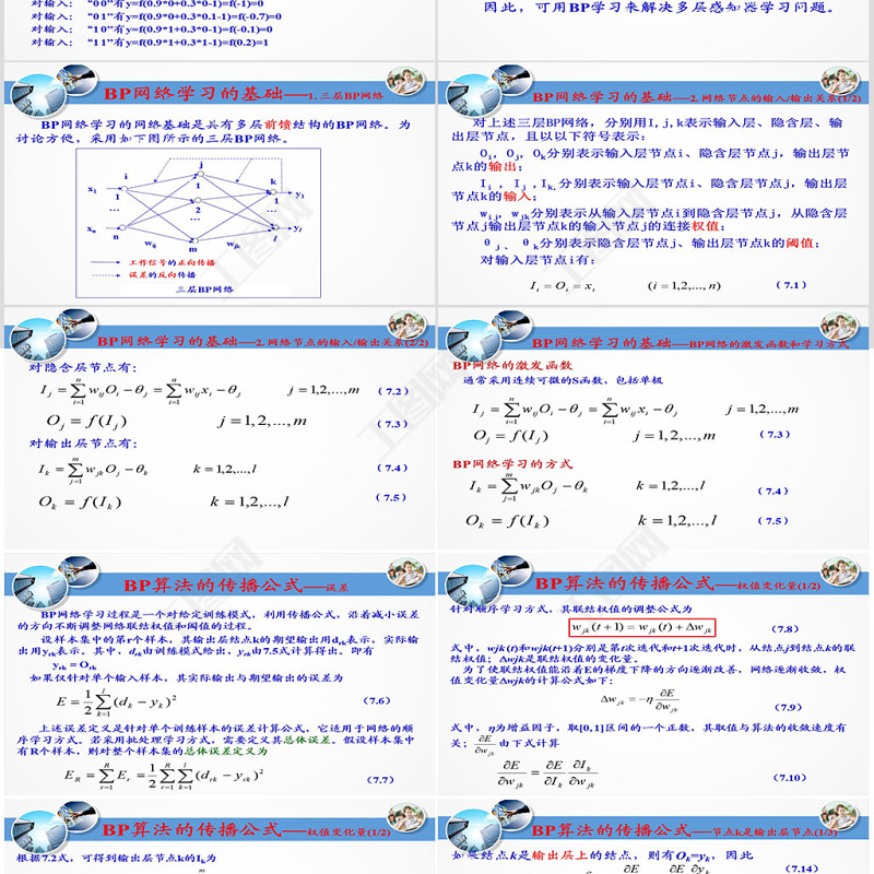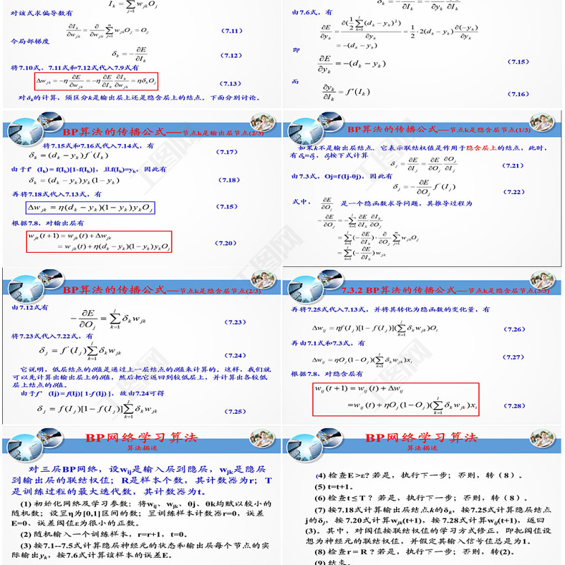 將7.15式和7.16式代入7.14式,有BP算法的傳播公式—節(jié)點(diǎn)k是輸出層節(jié)點(diǎn)(2/3)(7.17)(7.15)由于f’(Ik) = f(Ik)[1-f(Ik)],且f(Ik)=yk,因此有再將7.18式代入7.13式,有根據(jù)7.8,對(duì)輸出層有(7.20)(7.18)