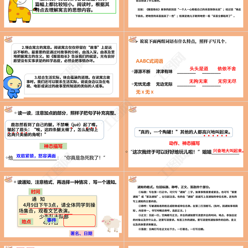 1.把握寓言中的“故事”。寓言從結(jié)構(gòu)上看,大多分為故事和教訓(xùn)兩部分。所以,首先要把寓言當(dāng)成故事去讀,弄清楚寓言故事敘述的是一件什么事,事情的起因、經(jīng)過(guò)、結(jié)果怎樣,故事中有哪些人物(有時(shí)是采用擬人手法寫的植物、動(dòng)物等),主要人物是誰(shuí),他們各自扮演了什么角色。 比如:《揠苗助長(zhǎng)》故事的起因是“一個(gè)人一心盼著自己的禾苗快快長(zhǎng)高”;經(jīng)過(guò)是“他走下田去,把地里的禾苗拔高了一些”;結(jié)果是他兒子跑到地里一看“禾苗全都枯死了”。