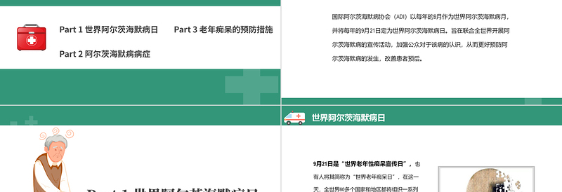 Part 1 世界阿爾茨海默病日 Part 2 阿爾茨海默病病癥Part 3 老年癡呆的預(yù)防措施目 錄CONTENTS