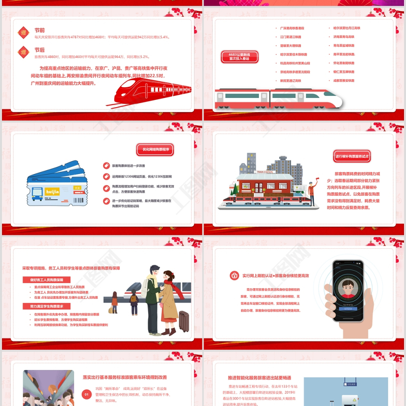 <p>搶票攻略</p><br><p>目錄</p><br><p>part 01.春運(yùn)歷史</p><br><p> 春運(yùn),即春節(jié)運(yùn)輸,是中國在農(nóng)歷春節(jié)前后發(fā)生的一種大規(guī)模的高交通運(yùn)輸壓力的現(xiàn)象。 以春節(jié)為中心,共40天左右,每年農(nóng)歷臘月十五到次年正月廿五。由國家發(fā)改委統(tǒng)一發(fā)布,交通運(yùn)輸部、民航局按此進(jìn)行專門運(yùn)輸安排的全國性交通運(yùn)輸高峰叫做春運(yùn)。一般意義上的春運(yùn), 是指中國大陸的城際交通,不包括中國大陸與香港、澳門和臺灣之間的交通以及國際交通。</p><br><p> 春運(yùn),一詞最早出現(xiàn)于1980年的《人民日報》。改革開放以來,隨著對人員流動限制的放寬,越來越多的人選擇離鄉(xiāng)外出務(wù)工、求學(xué)。諸多人群集中在春節(jié)期間返鄉(xiāng),形成了堪稱“全球罕見的人口流動”的春運(yùn)。近30多年來,春運(yùn)大軍從1億人次增長到2015年的37億人次,相當(dāng)于讓非洲、歐洲、美洲、大洋洲的總?cè)丝诎嵋淮渭摇?lt;/p><br><p> 春運(yùn)被譽(yù)為人類歷史上規(guī)模最大的、周期性的人類大遷徙。在40天左右的時間里,有30多億人次的人口流動,占世界人口(約70億人)的3/7,相當(dāng)于全國人民進(jìn)行兩次大遷移。中國春運(yùn)入選世界紀(jì)錄協(xié)會世界上最大的周期性運(yùn)輸高峰,創(chuàng)造了多項(xiàng)世界之最。大洋洲的總?cè)丝诎嵋淮渭摇?lt;/p><br><p> 2020年春運(yùn)火車票將于2019年12月12日開始發(fā)售,鐵路春運(yùn)自2020年1月10日開始,2020年2月18日結(jié)束,共40天,節(jié)前15天,節(jié)后25天。</p><br><p></p><br><p>part 02. 2020年鐵路春運(yùn)</p><br><p>節(jié)前每天共安排開行旅客列車4787對同比增加468對;平均每天可提供運(yùn)能942萬同比增長5.4%。節(jié)后旅客列車4860對,同比增加460對平均每天可提供運(yùn)能964萬,同比增長5.2%。 為提高重點(diǎn)地區(qū)的運(yùn)輸能力,在京廣、滬昆、貴廣等高鐵集中開行夜間動車組的基礎(chǔ)上,再安排渝貴間開行夜間動車組列車,同比增加22.5對,廣州到重慶間的運(yùn)輸能力大幅提升。</p><br><p>4683公里新線首次投入春運(yùn)廣深港高鐵香港段江門至湛江鐵路楚雄至大理鐵路哈爾濱至佳木斯鐵路杭昌高鐵杭州至黃山段京哈高鐵承德至沈陽段新民至通遼高鐵哈爾濱至牡丹江高鐵濟(jì)南至青島高鐵青島至鹽城鐵路南平至龍巖鐵路.懷化至衡陽鐵路銅仁至玉屏鐵路成都至雅安鐵路</p><br><p>優(yōu)化網(wǎng)絡(luò)購票程序旅客購票體驗(yàn)進(jìn)一步改善運(yùn)用新版12306網(wǎng)站頁面,優(yōu)化12306互聯(lián)網(wǎng)購票流程增加用戶掃碼登錄功能,減少旅客無效點(diǎn)擊,方便旅客快速購票進(jìn)一步優(yōu)化驗(yàn)證碼策略,最大限度減少旅客在購票環(huán)節(jié)出現(xiàn)驗(yàn)證碼</p><br><p>進(jìn)行候補(bǔ)購票服務(wù)試點(diǎn) 旅客購票耗費(fèi)的時間精力減少;選取春運(yùn)期間部分能力緊張方向列車的長途區(qū)段,開展候補(bǔ)購票服務(wù)試點(diǎn),以免旅客在購票需求沒有得到滿足時,耗費(fèi)大量時間和精力反復(fù)查詢余票。</p><br><p>采取專項(xiàng)措施,務(wù)工人員和學(xué)生等重點(diǎn)群體旅客購票有保障做好務(wù)工人員購票保障重點(diǎn)保障用工企業(yè)和零散務(wù)工人員購票為務(wù)工人 員優(yōu)先辦理加開旅客列車團(tuán)體票在重 點(diǎn)車站設(shè)置售票專窗,方便外出務(wù)工人員購票努力滿足學(xué)生購票需求在預(yù)售期外優(yōu)先集中辦理、預(yù)售期內(nèi)預(yù)留部分票額延長學(xué)生票預(yù)售期,方便學(xué)生購買返程票利用互聯(lián)網(wǎng)接續(xù)換乘功能,為學(xué)生購買聯(lián)程車票提供便利</p><br><p>實(shí)行網(wǎng)上刷臉認(rèn)證●旅客身份核驗(yàn)更高效 需辦理常旅客會員激活和身份信息核驗(yàn)的旅客,可通過網(wǎng)上刷臉認(rèn)證進(jìn)行身份核驗(yàn),無需再去車站窗口核驗(yàn)證件,實(shí)現(xiàn)全部流程網(wǎng)上自助辦理,旅客身份信息核驗(yàn)將更為便捷高效。</p><br><p>落實(shí)出行基本服務(wù)標(biāo)準(zhǔn)旅客乘車環(huán)境得到改善01鞏固“廁所革命” 成效,運(yùn)用好“雙所長”在設(shè)備管理和衛(wèi)生保潔中的長效機(jī)制,動態(tài)保持廁所干凈、整潔、無異味。02抓好站車供水、餐飲供應(yīng)、環(huán)境衛(wèi)生、車廂溫度等基本服務(wù)環(huán)節(jié),營造良好的候乘環(huán)境。03加強(qiáng)文明出行宣傳引導(dǎo),依法依規(guī)處置違反乘車秩序的行為。</p><br><p>推進(jìn)智能化服務(wù)旅客進(jìn)出站更暢通 推進(jìn)車站暢通工程專項(xiàng)行動,在去年133個車站的基礎(chǔ)上,大規(guī)模部署自助進(jìn)站核驗(yàn)設(shè)備, 2019年春運(yùn)在300個車站實(shí)現(xiàn)旅客自助進(jìn)站核驗(yàn),大幅提高進(jìn)站效率,提升旅客體驗(yàn)。 在近700個動車組??康能囌?,實(shí)行持二代身份證自助進(jìn)出站檢票,同比增加300多個車站。 推廣城際鐵路便捷掃碼進(jìn)站方式,在長株潭城際鐵路試點(diǎn)中鐵e卡通,實(shí)現(xiàn)旅客刷手機(jī)二維碼自助扣款便捷乘車。</p><br><p>創(chuàng)新安檢和接駁服務(wù)旅客換乘更便捷 推進(jìn)鐵路車站與地鐵站安檢互認(rèn)或地鐵認(rèn)可鐵路安檢,減少旅客重復(fù)安檢。 