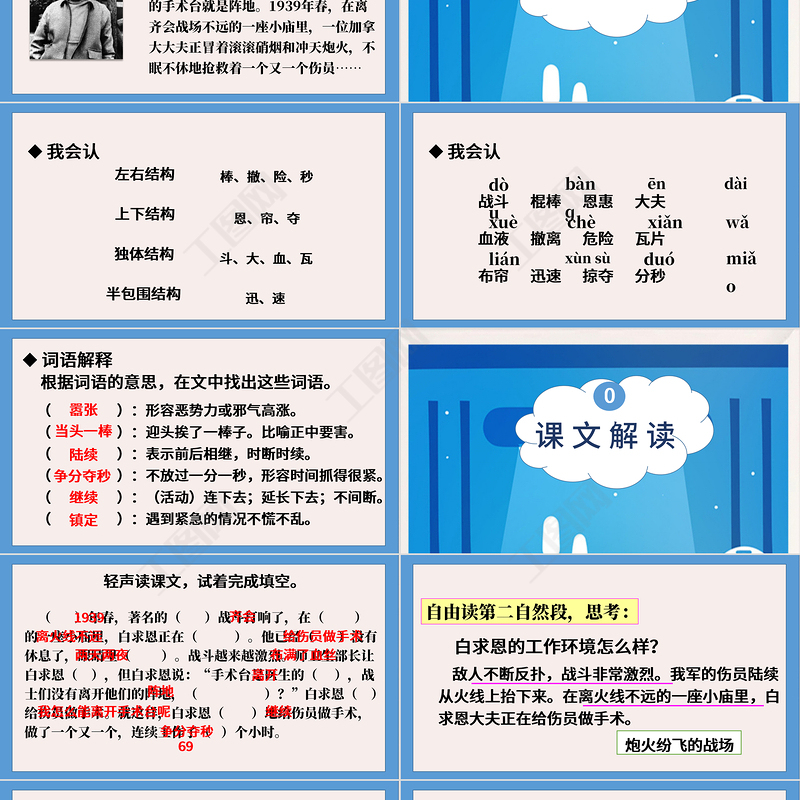 思想提升 本文講述了白求恩大夫在萬分危急的情況下,堅守陣地,連續(xù)三天三夜冒著生命危險為傷員做手術的事跡,表現(xiàn)了白求恩大夫的國際主義精神和對工作極端負責、對同志極端熱忱的高尚品質(zhì)。 想一想,當齊會戰(zhàn)斗勝利結束了,獲救的傷員遇到白求恩大夫會怎樣做?怎么樣說?