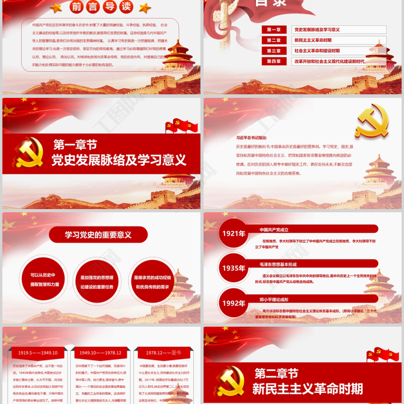 <p>—熱烈慶祝中國共產黨建黨99周年—光輝的歷史匯報人:XXXX</p><br><p>中國共產黨在近百年艱辛的奮斗歷史中,積累了大量的黨建經(jīng)驗、斗爭經(jīng)驗、執(zhí)政經(jīng)驗、 社會主義建設的經(jīng)驗等,以及經(jīng)受挫折失敗的教訓,都是我們寶貴的財富。這些經(jīng)驗是幾代中國共產黨人的智慧結晶,是我們治黨治國的寶貴精神財富。 認真學習黨史既是一次把握規(guī)律、把握未來的理論學習,也是一次堅定信仰、堅定方向的黨性教育。通過學習必將增強我們對黨的感情認同、理論認同、 政治認同。對繼承和發(fā)揚光榮革命傳統(tǒng)、黨的優(yōu)良作風,對提高自己的認識能力和處理實際問題的能力都是十分必要的和有益的。</p><br><p>第一章第二章第三章第四章黨史發(fā)展脈絡及學習意義新民主主義革命時期社會主義革命和建設時期改革開放和社會主義現(xiàn)代化建設新時代目 錄</p><br><p>第一章節(jié)第一章節(jié)黨史發(fā)展脈絡及學習意義</p><br><p>指出: 歷史是最好的教科書,中國革命歷史是最好的營養(yǎng)劑。學習黨史、國史,是堅持和發(fā)展中國特色社會主義、把黨和國家各項事業(yè)繼續(xù)推向前進的必修課。在對歷史的深入思考中做好現(xiàn)實工作,更好走向未來,不斷交出堅持和發(fā)展中國特色社會主義的合格答卷。</p><br><p>可以從歷史中攝取智慧和力量學習黨史的重要意義是加強黨的思想理論建設的重要任務是繼承黨的成功經(jīng)驗和優(yōu)良傳統(tǒng)的需求</p><br><p>在陳獨秀、李大釗領導下創(chuàng)立了中中國共產黨成立在陳獨秀、李大釗領導下創(chuàng)立了中國共產黨中國共產黨成立1921年遵義會議確立以毛zd在中共中央的領導地位,是中共歷史上一個生死攸關的轉折點,標志著中國共產黨從幼稚走向成熟。毛zd思想基本形成1935年南方談話標志著中國特色社會主義理論體系基本成形。(即**理論,三個代表重要思想和科學發(fā)展觀等)**理論成形1992年</p><br><p>歷史選擇了中國共產黨,這不是一句空話。1840年鴉片戰(zhàn)爭后,中國嘗試過許多救亡圖存之路,從太平天國、戊戌變法到辛亥革命,從舊式農民起義到資產階級改良運動,最后都走不通,只有中國共產黨領導的革命事業(yè)成功了。說明中國共產黨代表了人民的意愿和心聲,順 應了歷史的規(guī)律。舊中國留下了一個經(jīng)濟凋敝、百廢待興的爛攤子。中國共產黨頂住各種壓力,領導中國人民,自力更生,艱苦奮斗,使中國從一一個落后的農業(yè)國發(fā)展成具備獨立、完整的工業(yè)體系的國家。這說明盡管社會主義道路是前無古人,充滿著探索和艱辛,中國共產黨有能力帶領中國人 民建設好新中國。 中國要發(fā)展、生活要小康,就要回答好什么是社會主義,怎樣建設社會主義的問題。2017年 ,我國經(jīng)濟總量超過82.7萬億元人民幣,排名世界第二C,人民生活實現(xiàn)了從貧困到溫飽再到總體小康的跨越。這就告訴我們,中國共產黨成功開創(chuàng)了中國特色社會主義的偉大道路,從理論和實踐上解決和回答了這個重 大課題。</p><br><p>第一章節(jié)第二章節(jié)新民主主義革命時期</p><br><p>陳獨秀蔡和森1920年8月,陳獨秀在上海發(fā)起成立了中國共產黨的第一一個早期組織。1920年9月1日,陳獨秀在《新青年》發(fā)表的《對于時局之我見》一文中,曾稱“吾黨”為“社會黨”,后來才改稱為”共產黨” 最早提出“中國共產黨"這一名稱的是蔡和森。1920年8月13日和9月16日,正在留法勤工儉學的他,在給毛zd寫的兩封信中,詳細地研討了共產黨問題,提出:“先要組織黨一 共產黨, 因為它是革命運動的發(fā)動者、宣傳者、先鋒隊、 作戰(zhàn)部。 他在對西歐各國共產黨特別是俄國共產黨考察的基礎上,提出了具體的建黨步驟,其中包括”明目張膽正式成立一個中國共產黨” 在此前后,陳獨秀在.上海,李大釗、 張申府在北京也通過信函討論了黨的名稱問題,決定采用“共產黨”作為中國無產階級政黨的名稱。中國共產黨名稱的由來</p><br><p>五四運動是1919年5月4日發(fā)生在北京的一場以青年學生為主,廣大群眾、市民、 工商人士等中下階層共同參與的,通過示威游行、請愿、 罷工、 暴力對抗政府等多種形式進行的愛國運動,是中國人民徹底的反對帝國主義、封建主義的愛國運動。 從1918年11月的”公理戰(zhàn)勝強權”慶典,到次年1月的巴黎會議,短短兩個月時間,當時的中國充分詮釋了“自古弱國無外交”的定律,所謂的”公理戰(zhàn)勝強權”不過是一個美麗的童話。面對這樣屈辱的局面,從5月1日開始,北京的學生紛紛罷課,組織演講、宣傳,隨后天津、上海、廣州,南京,杭州,武漢,濟南的學生、工人也給予支持。 五四運動直接影響了中國共產黨的誕生和發(fā)展,中國共產黨黨史-般將其定義為“反帝反封建的愛國運動” (注意這里的“封建”一詞是泛化的封建觀),并以此運動作為舊民主主義革命和新民主主義革命的分水嶺。 五四運動背景</p><br><p> 毛zd思想的活的靈魂,是貫穿于新民主主義革命、社會主義革命和社會主義建設、革命軍隊的建設和軍事戰(zhàn)略、政策和策略、思想政治工作和文化工作、黨的建設、各個組成部分的立場、觀點和方法,它們有三個基本方面,即:實事求是, 就是一切從實際出發(fā),理論聯(lián)系實際,把馬克思列寧主義