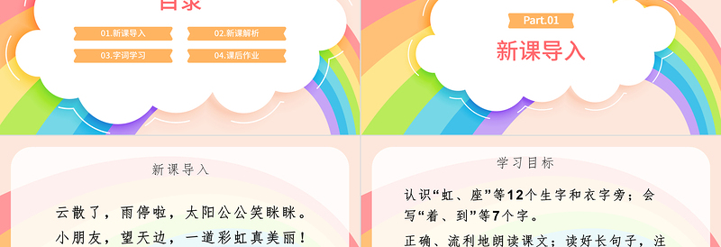 學(xué)習目標認識“虹、座”等12個生字和衣字旁;會寫“著、到”等7個字。正確、流利地朗讀課文;讀好長句子,注意分句間的停頓,讀出問句的語氣。感受純真的想象世界,學(xué)會關(guān)心家人。