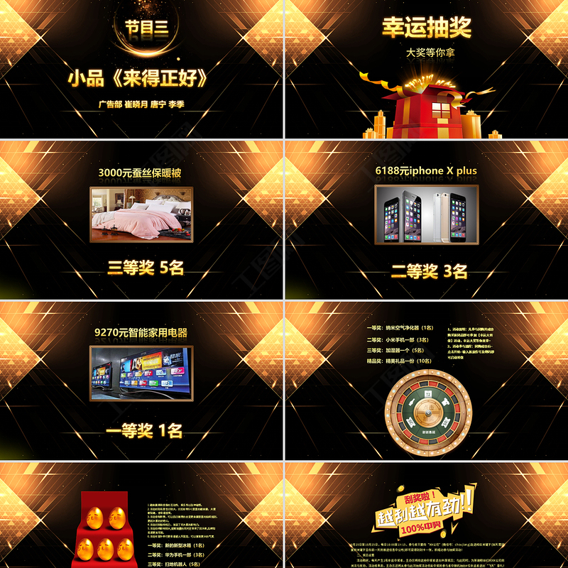 一等獎:新的新型冰箱(1名)二等獎:華為手機一部(3名)三等獎:掃地機器人(5名)精品獎:精美禮品一份(10名)1.砸金蛋具有很強的互動性、娛樂性以及神秘感。2.活動的知名度也比較大,比如非常6+1里面的砸金蛋,大家都知道,很容易接受。3.活動很有新意,可以自己隨意的去變更金蛋里面的抽獎規(guī)則,激起大家的好奇心。4.活動比較獨特給力,加深了對大家的影響力。5.活動后續(xù)影響較大,提高銷量的同時還帶來了回頭率,品牌知名度更加牢固。6.活動在室外舉行更容易被人所發(fā)現(xiàn),可以營造更大的氣氛