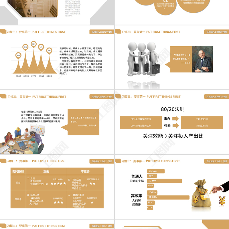 習(xí)慣三: 要事第一 PUT FIRST THINGS FIRST 重要之事決不可受芝麻綠豆小事牽絆。-------歌德,德國詩人帕累托原則80/20法則在任何特定的群體中,重要的因子通常只占少數(shù),而不重要的因子占多數(shù),因此只要能控制具有重要性的少數(shù)因子即能控制全局高效能人士的七個習(xí)慣