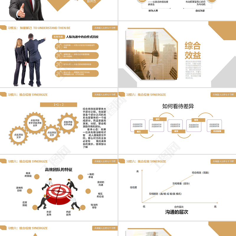 習(xí)慣六:統(tǒng)合綜效 SYNERGIZE 點擊添加文字點擊添加文字點擊添加文字點擊添加文字點擊添加文字點擊綜合統(tǒng)效就是整體大于部分之和,也就是說各個部分之間的關(guān)系也是整體的一個組成部分,而且是最具激發(fā)、分配、整合和激勵作用的部分。 基本心態(tài):如果一位具有相當(dāng)聰明才智 的人跟我意見不同,那么對方的主張必定有 我尚未體會的奧妙,值得加以了解1+1﹥2高效能人士的七個習(xí)慣