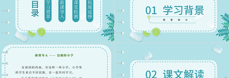新課導(dǎo)入 —— 邊疆的小學(xué) 在祖國(guó)的西南,有這樣一所小學(xué)。小學(xué)里的學(xué)生來(lái)自不同民族,在一起共同學(xué)習(xí)。 今天我們通過(guò)學(xué)習(xí)《大青樹(shù)下的小學(xué)》這篇文章,一起走進(jìn)一所可愛(ài)的邊疆小學(xué)。